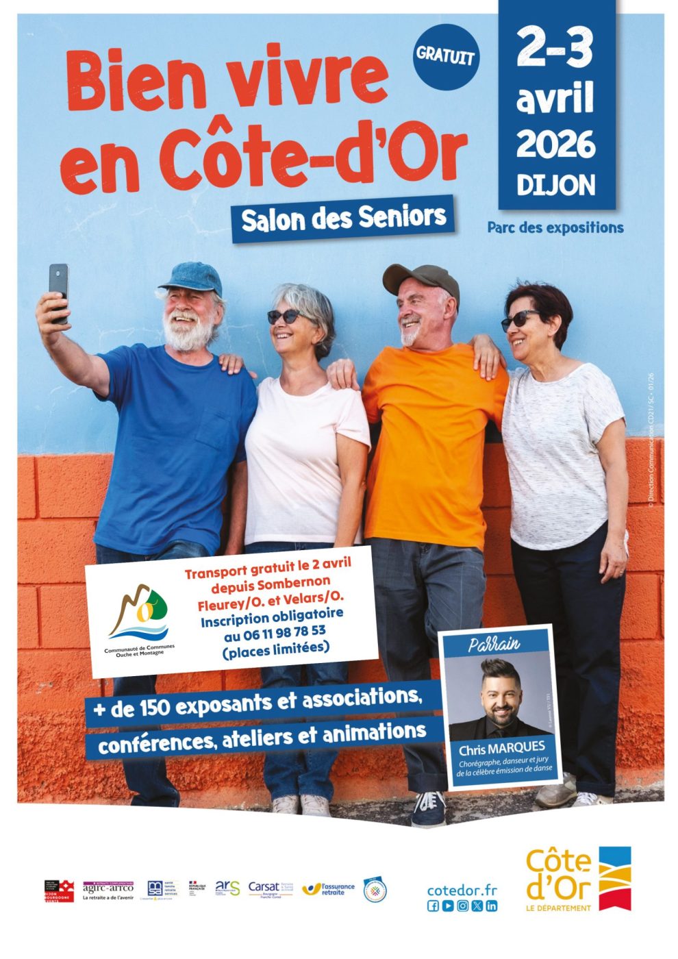 Le Salon des Séniors est de retour : rendez-vous les 2 et 3 avril à Dijon ! Vous habitez sur le territoire Ouche et Montagne et vous avez plus de 60 ans ? Profitez du transport gratuit depuis 3 communes du territoire, pour vous rendre sur le salon le 2 avril après-midi. Attention, places limitées.
